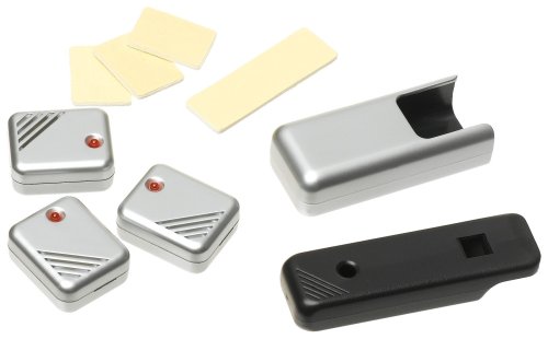 Stop the frustrating hunts for remote controls that get lost in sofa cushions or fall out of sight. With this two part signal system, all you have to do is toot the whistle…and follow the locator beeps and flashing lights to your missing remotes. Includes whistle transmitter with TV caddy plus three micro-receivers that patch to remotes with double-stick tape. 2 button cell batteries per receiverCustomer Reviews